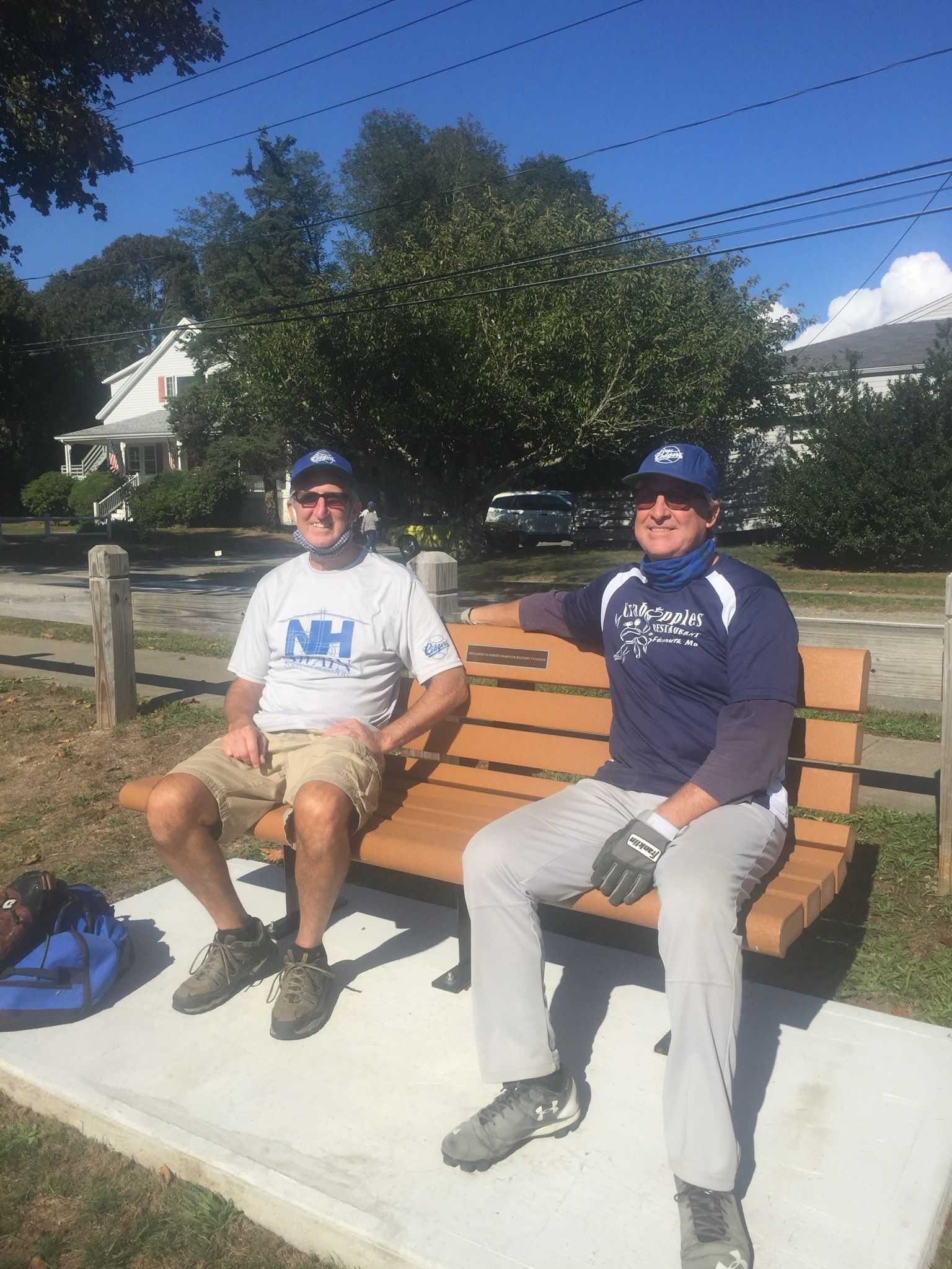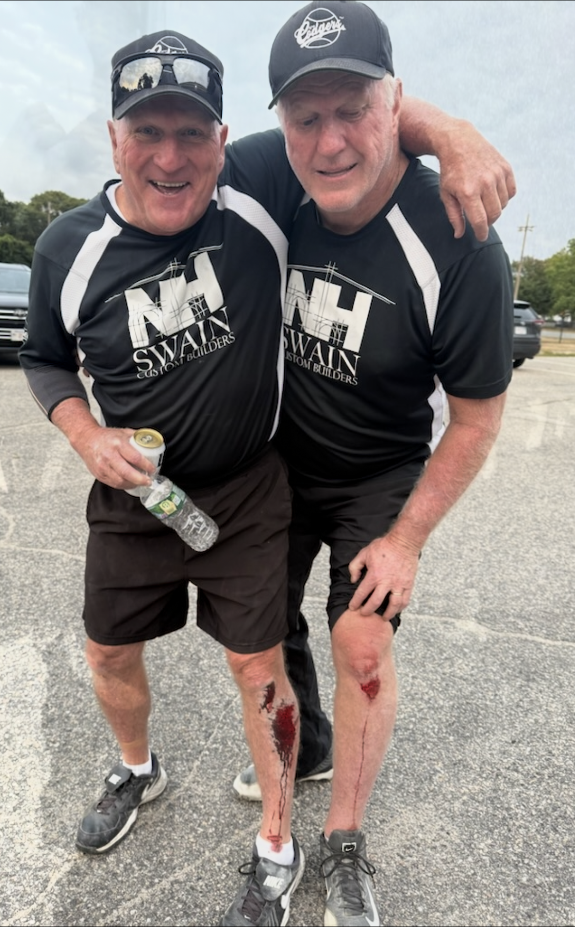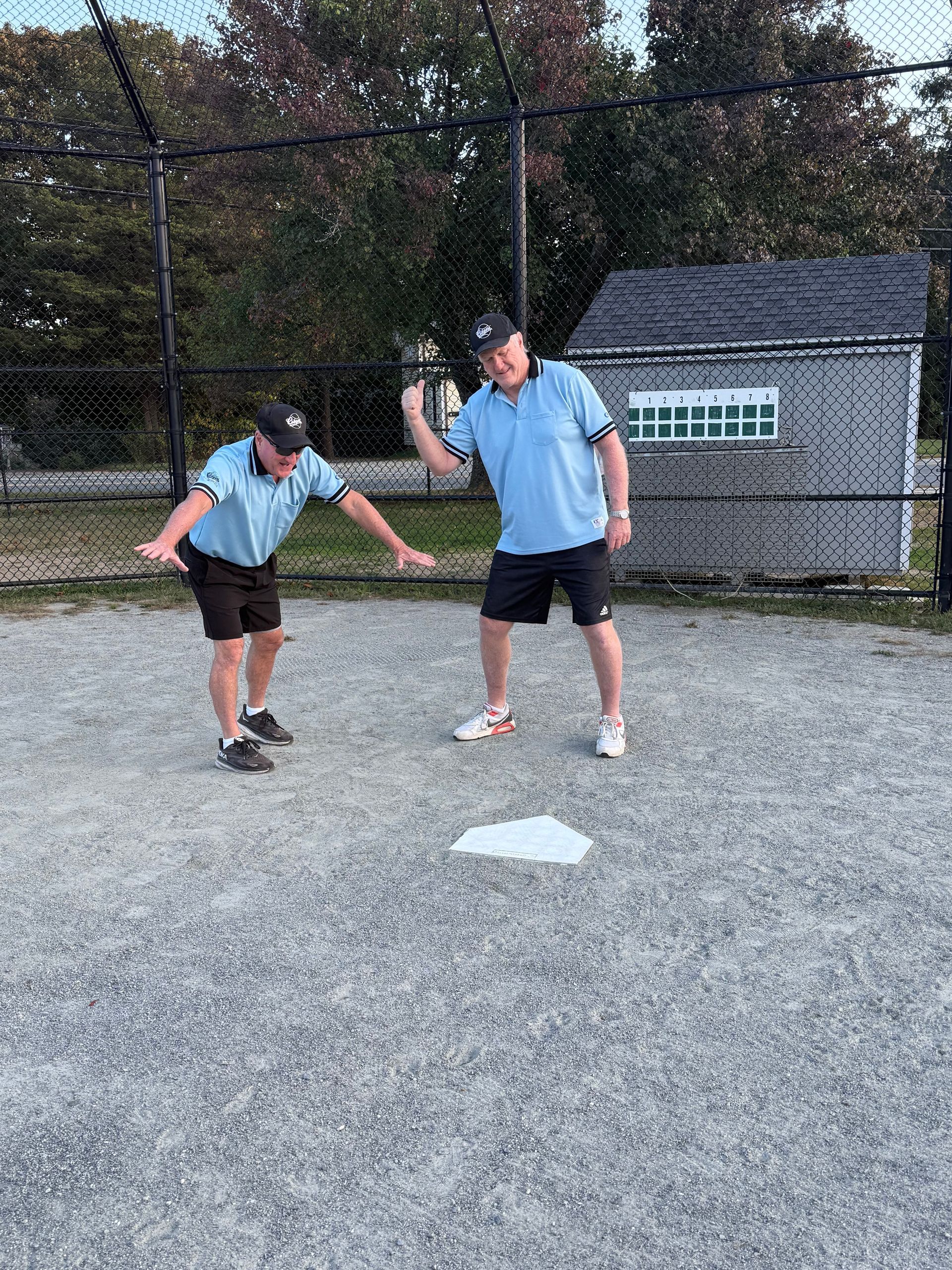 Kevin (L) and his brother Rick. The brothers are long time members of coach Rick's NH Swain team who leave everything on the field. They also double as umpires in the league, although they may not always agree on everything.